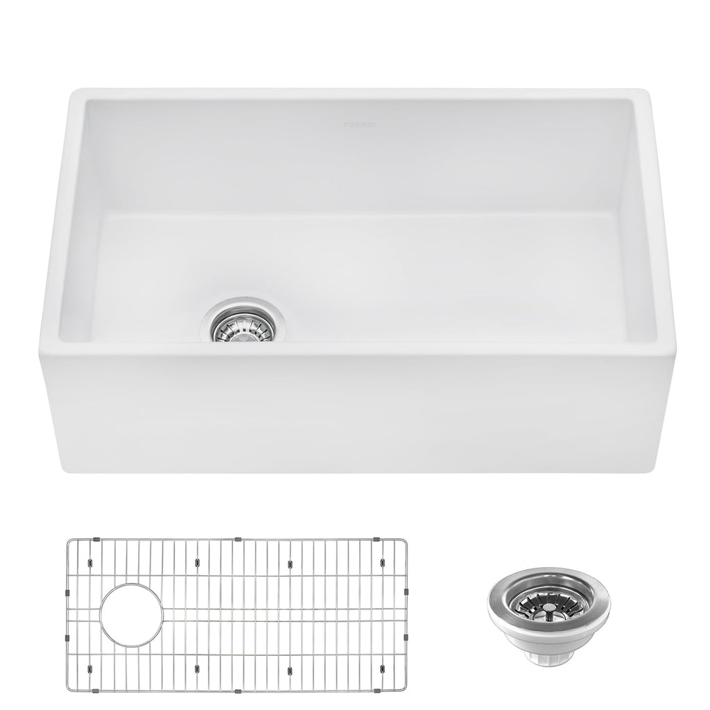 - INCLUDED IN BOX: Fireclay sink, bottom rinse grid, drain assembly, installation guide.