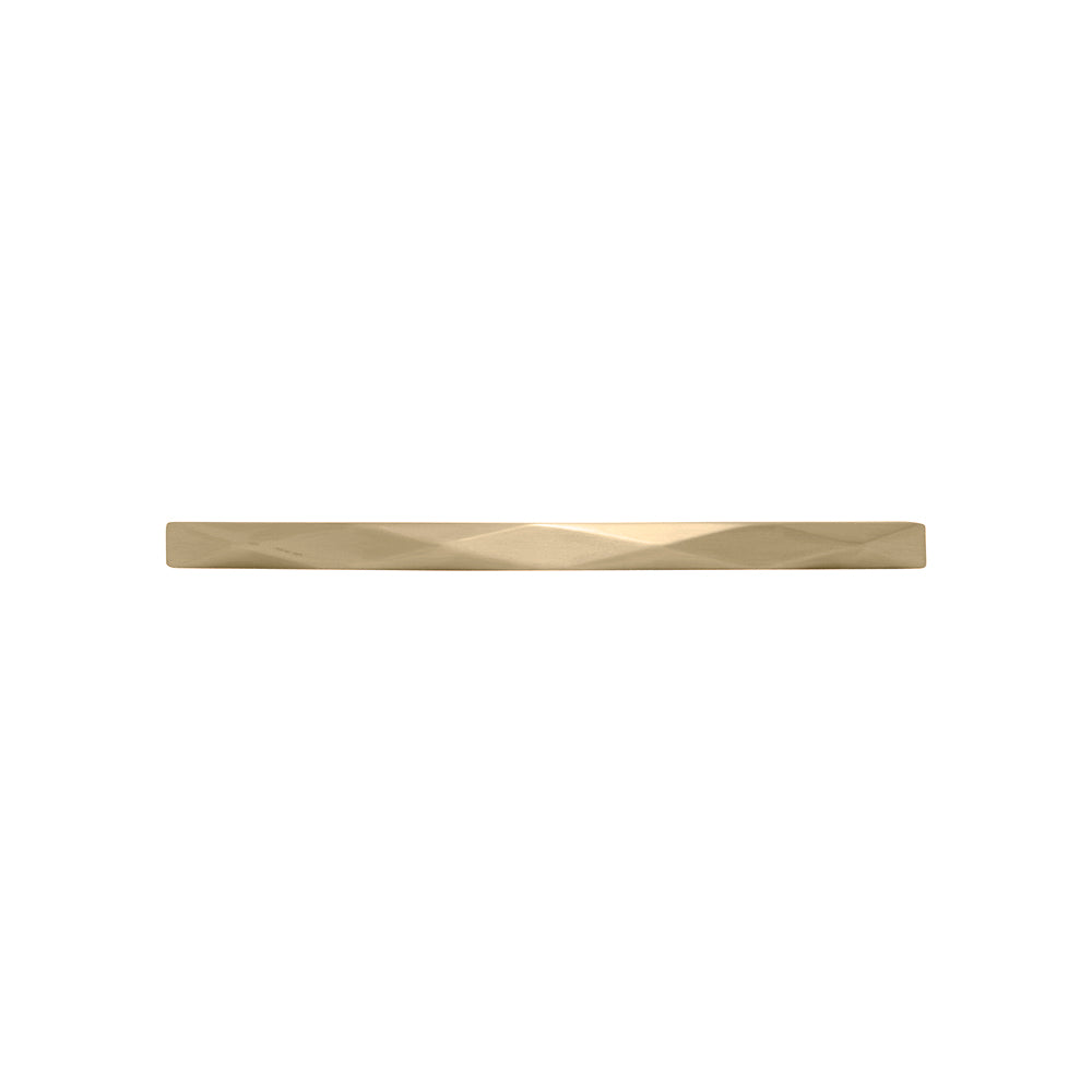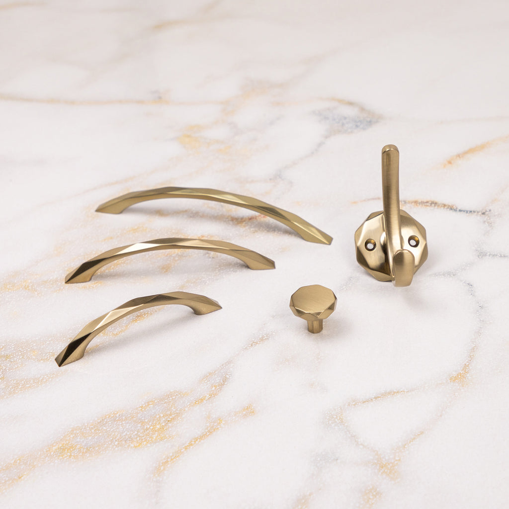 The unique form of the Karat collection showcases glitz and glamor in a space. Its decorative elements allow for adding some subtle ornamentation to cabinets or furniture. Chrome and Satin Nickel highlight the faceted surfaces and show off the sparkle; Brushed Golden Brass is modern and luxurious, and Matte Black is more geometric and even industrial.