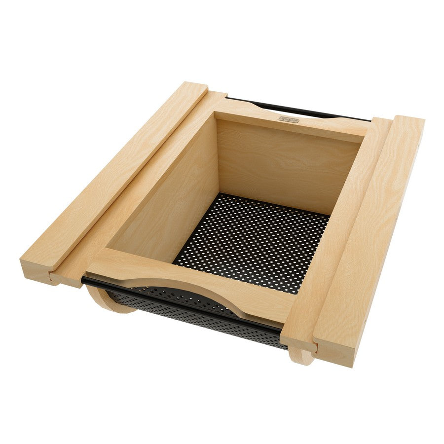 Store your produce in style! These removable baskets are designed for base cabinets and intended for use without cabinet doors. They are available in your choice of walnut or maple construction and feature either a stainless-steel bottom with matching handles or a luxurious black bottom with matching handles. The perforated design promotes ample air circulation and prevents moisture buildup, keeping your fruits and vegetables fresher for longer. Enjoy simple installation and easy transportation using the built-in handles.